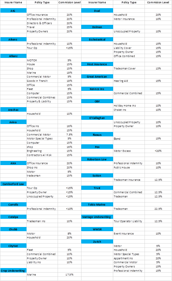 Worldwide Insurance Brokers and Advisors Limited is remunerated by a professional fee for the initial work activity and time spent in seeking the best terms, advice, product and product producer for your specific needs. An administration fee is also charged for the activity involved in the renewal of the policy and also any alterations that take place during and at termination of a policy. A scale of our fees is under noted. We are usually remunerated by commission received from the product producers for the work involved in placing an order and finalising the product with them on your behalf. The range of commission can vary, depending on the product, between 0% and 25% Some product producers do not pay a commission. Click here for list of suppliers and their commission levels
